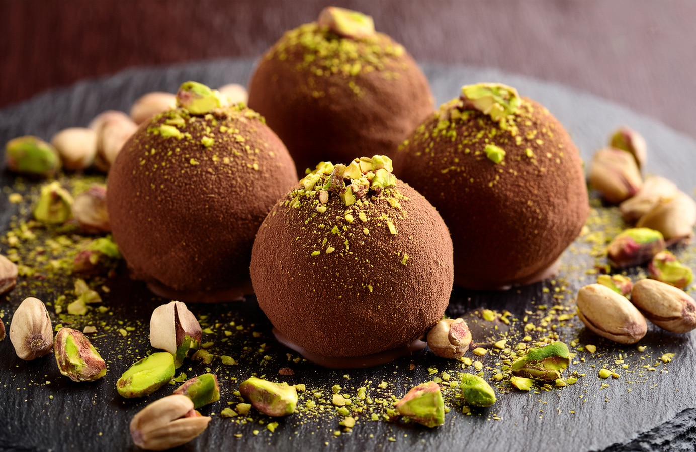 - When well-chilled, shape into 1-inch balls and roll in chopped pistachios.½ cup finely chopped pistachios